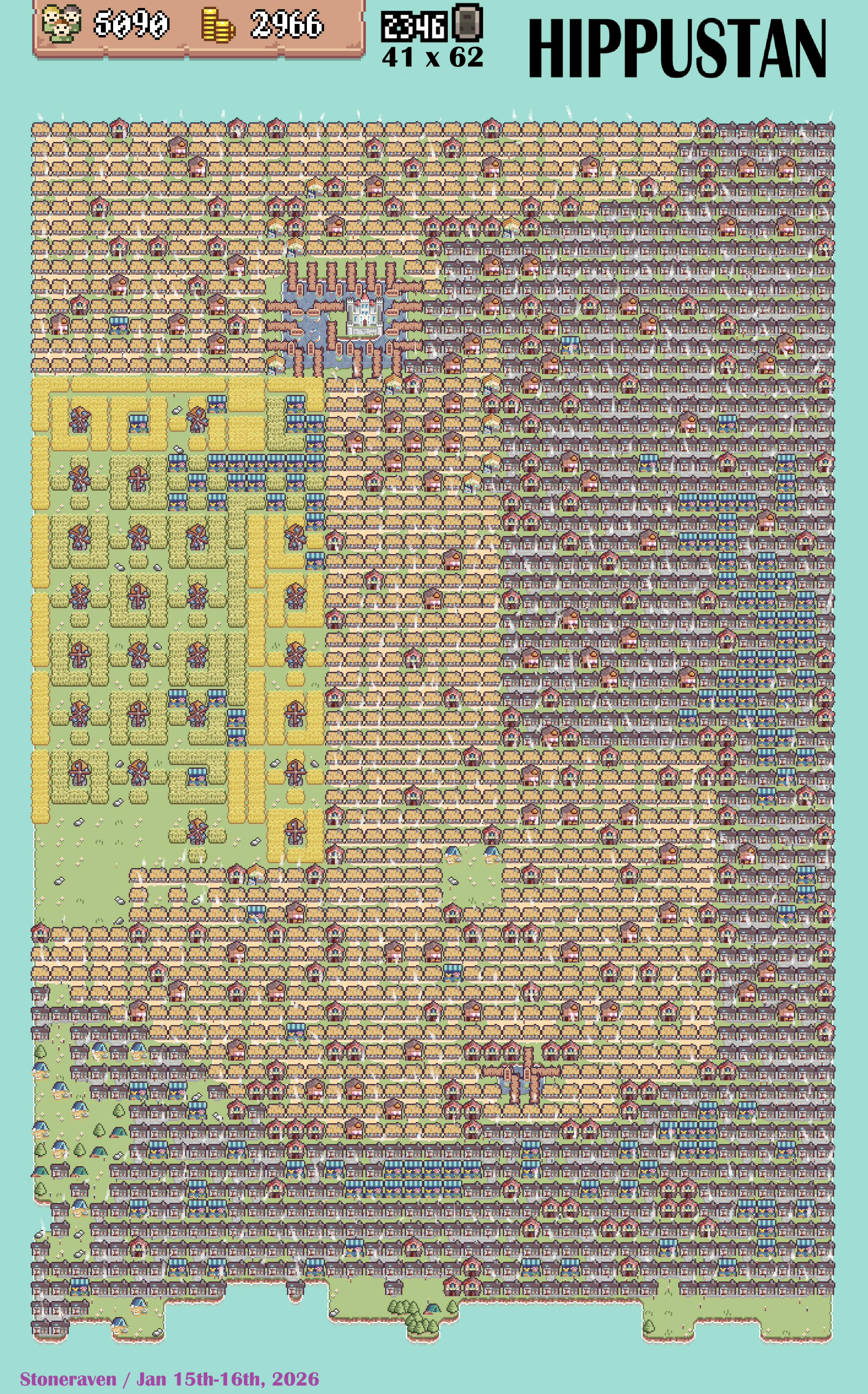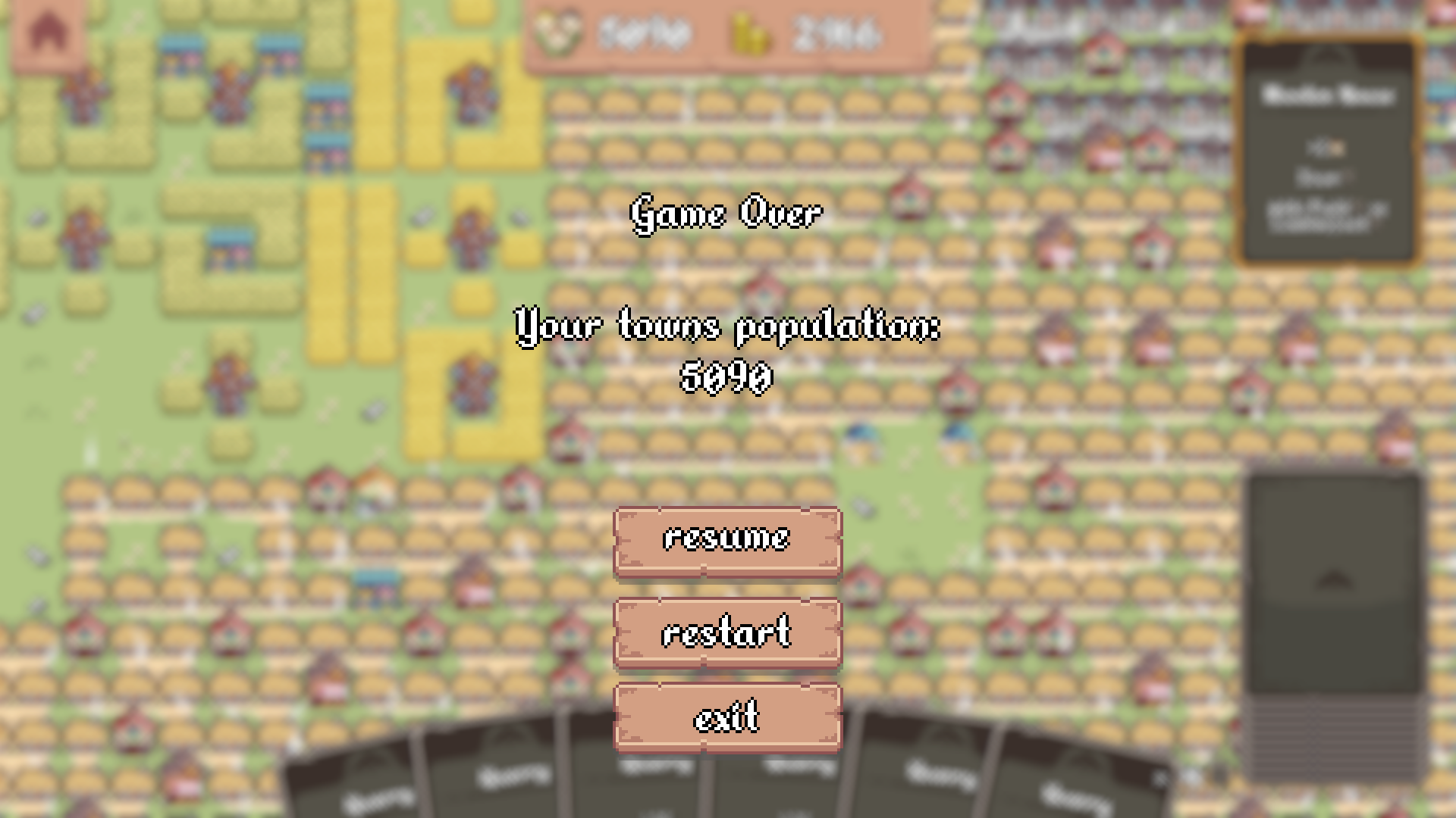 Failed attempt to break demo's population record. Unlike usually, this time game ended 'normally' to the Game Over because of lack of rocks to quarry. My mistake was to start Stone House multiplication process a little bit too early and aggressively, and I ruined the deck balance and card-economy as a consequence. Biggest Card deck I have ever had, btw. 2346 Cards! Two very long days of gaming, with total playtime about 30h. It's damn time consuming to try to reach to a new record breaking grounds, and eventual end results of these efforts are always very ugly maps.