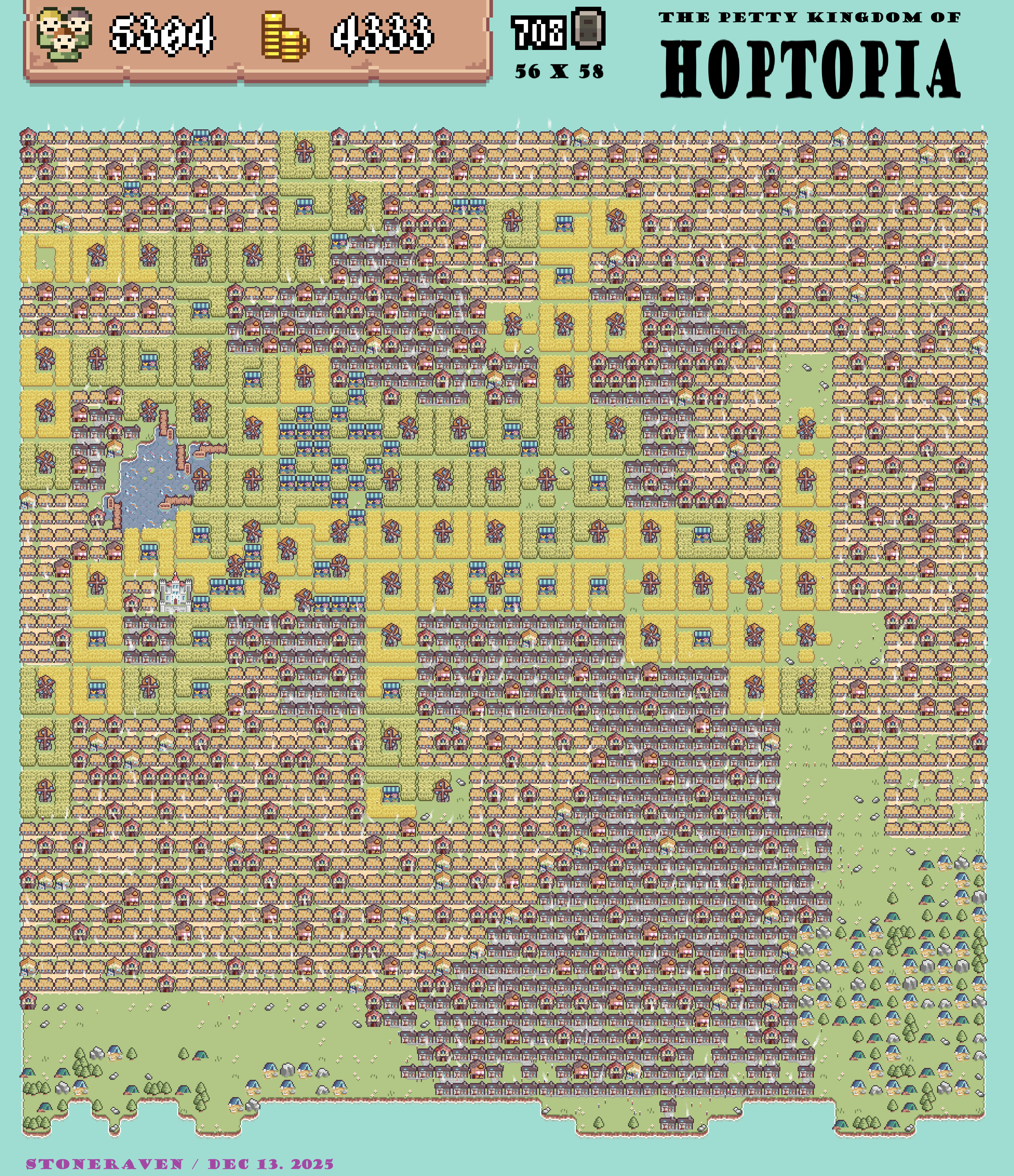 Maps of Hoptopia 2114 (44x37), 3512 (47x50), and 5304 (56x58) in same scale. There are more screenshots taken, but I draw only these three maps to demonstrate how the kingdom grew. The Castle's relative place stays same in all above maps as the West and North boundaries were already "locked" in pop. 2114 map and further expansions were made only to East and South.