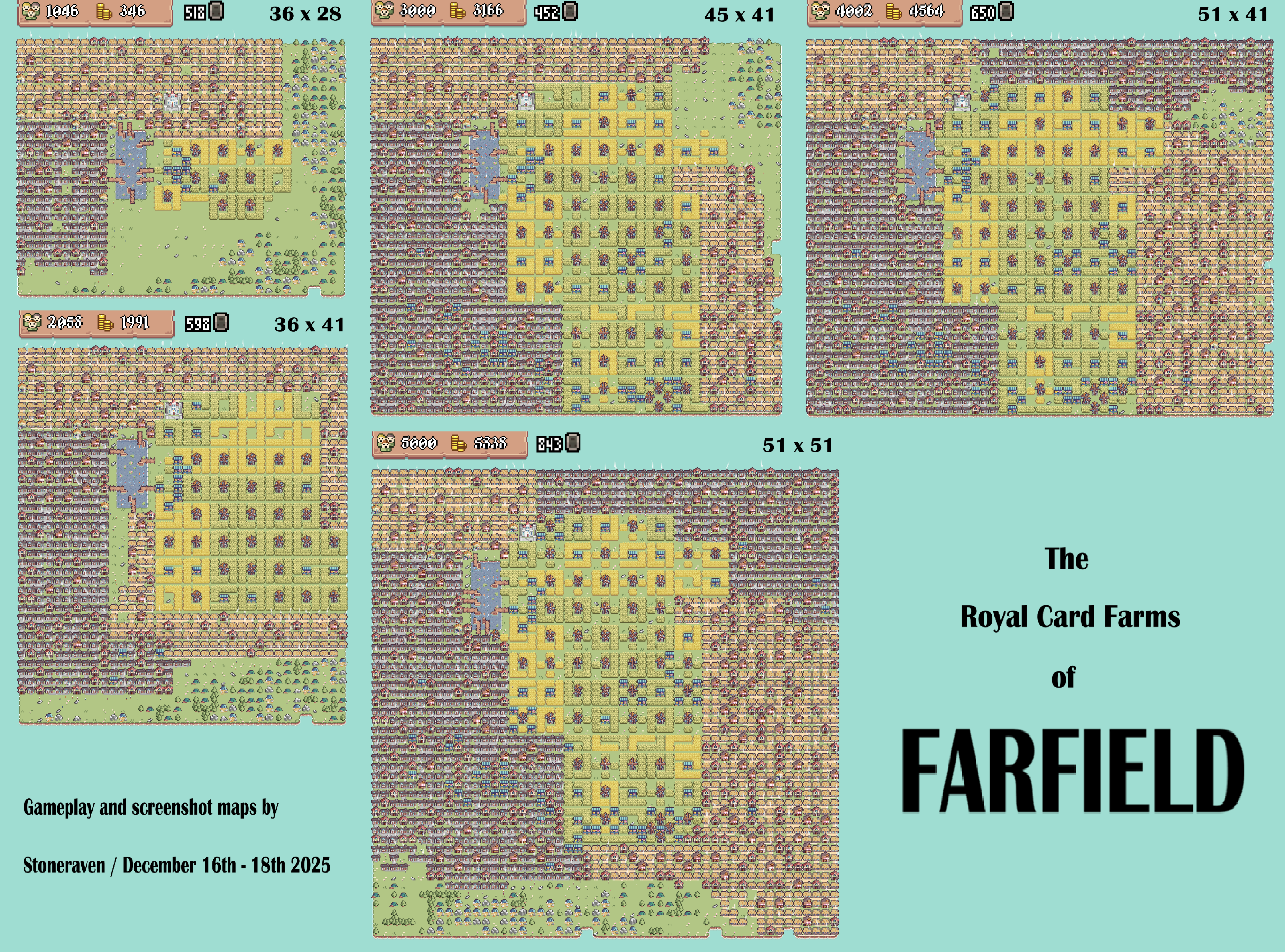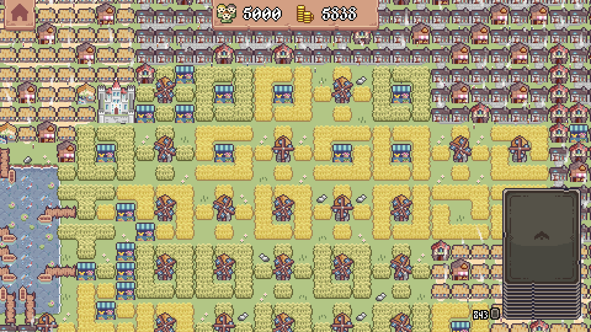 Failed attempt to break Demo version's population record, using as small map bounding box as possible. Game ended to apparent memory related issues when drawing the map of pop. 5000 Farfield (below). New money record though: 5838 coins! There was real potential for the new record. In the game I tried same old ideas but with more rigorous and systematic application, yet there are still room for making some further streamlinings, for example always discard non-forced Bakery-cards after economy is enough robust. Same way with Fishshops. They are just a waste of space.